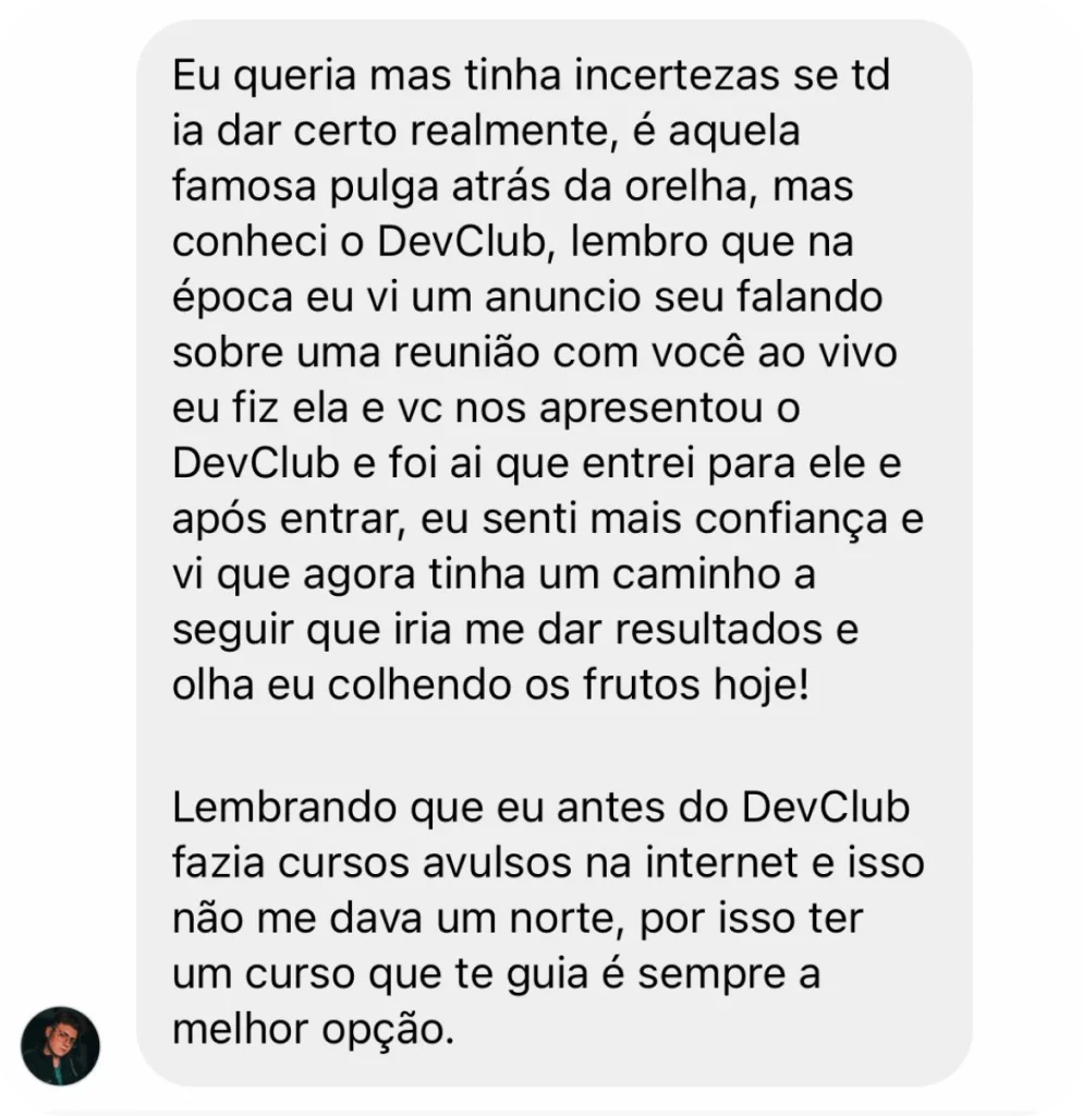 De eletricista a Dev Sênior em empresas como Santander, BTG Pactual, PI Investimentos e Toro Investimentos, dedica-se a levar pessoas do absoluto zero em programação aos melhores empregos do mercado.